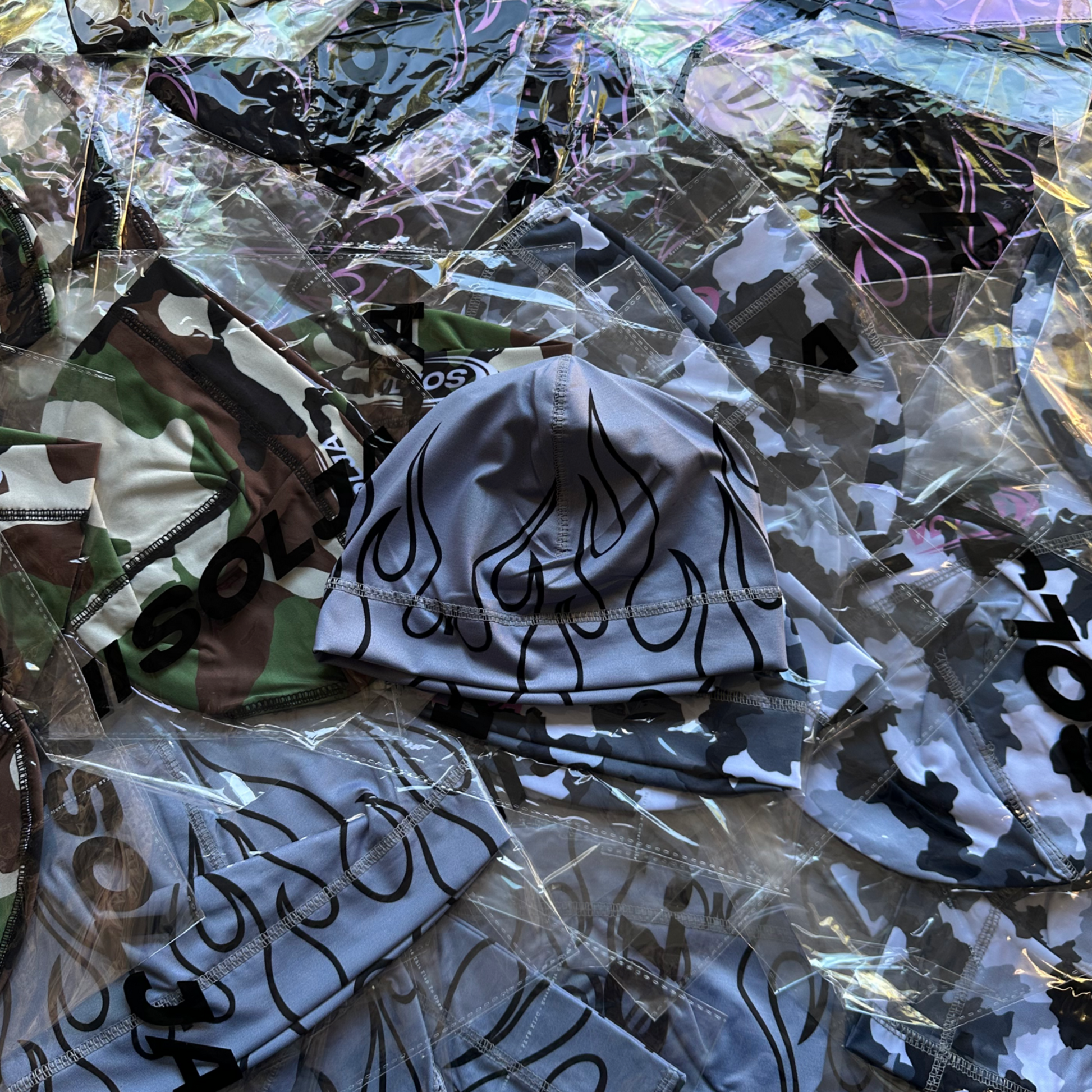 Lightweight, stretch-fit skully made from breathable spandex for all-day comfort. Designed to stay secure with a snug, flexible fit. Available in Grey/Black and Black/Pink Flame.